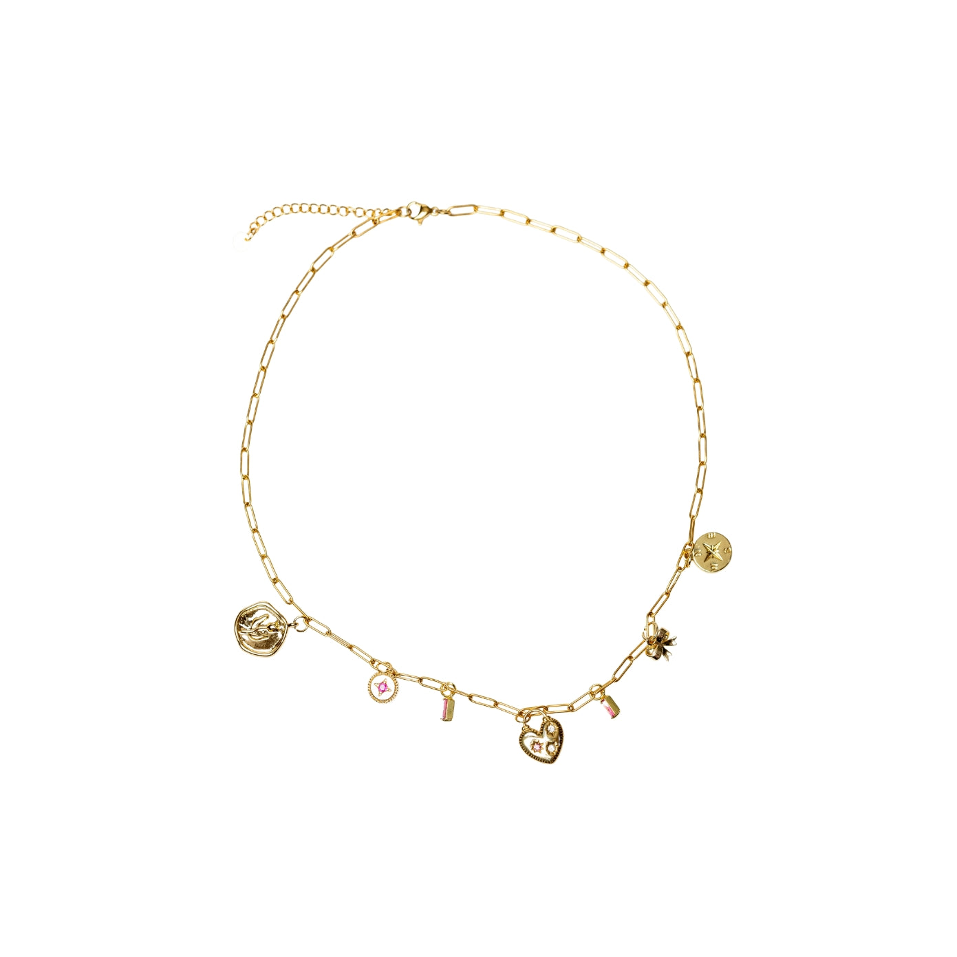 The charm queen you didn’t know you needed. With golden details and playful pops of pink, this necklace is all about mixing luxe vibes with a touch of whimsy. Wear it solo or stack it up for the ultimate statement