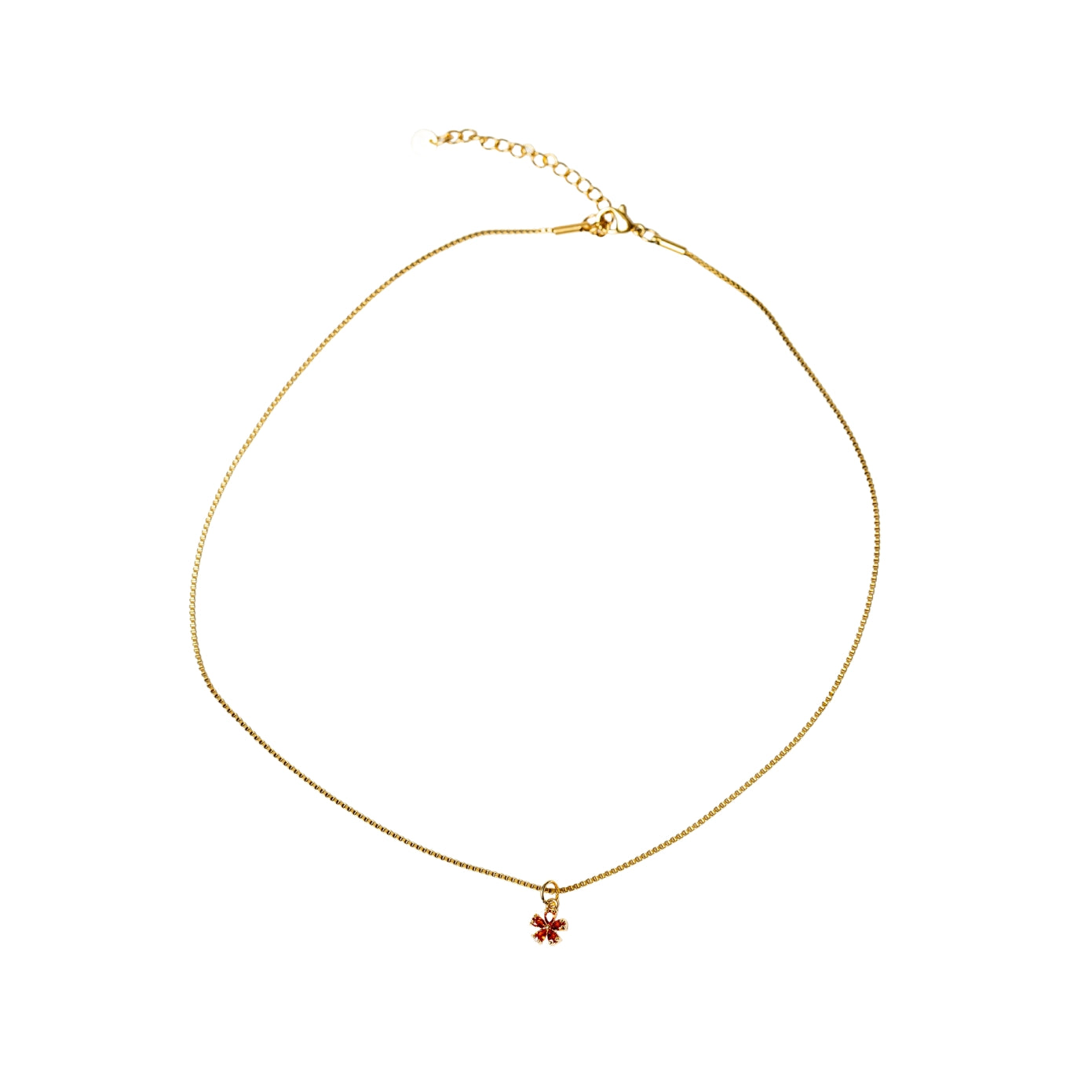 A bold red flower on a sleek gold chain. The perfect blend of classic vibes and modern style.