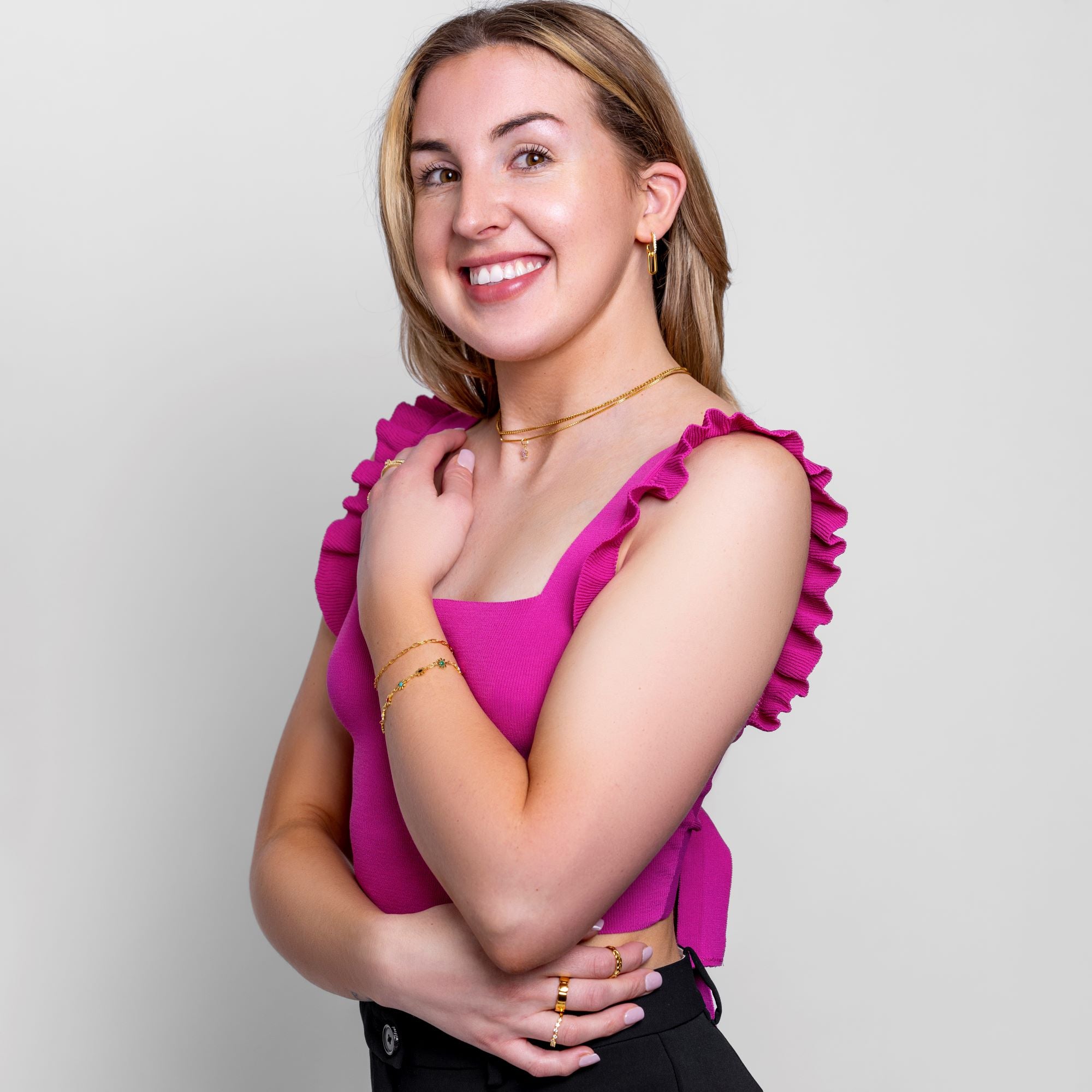 Sleek, bold, and effortlessly modern. The Millenia Ring features a statement design with polished gold links, bringing a contemporary edge to your stack or a standout moment worn solo.