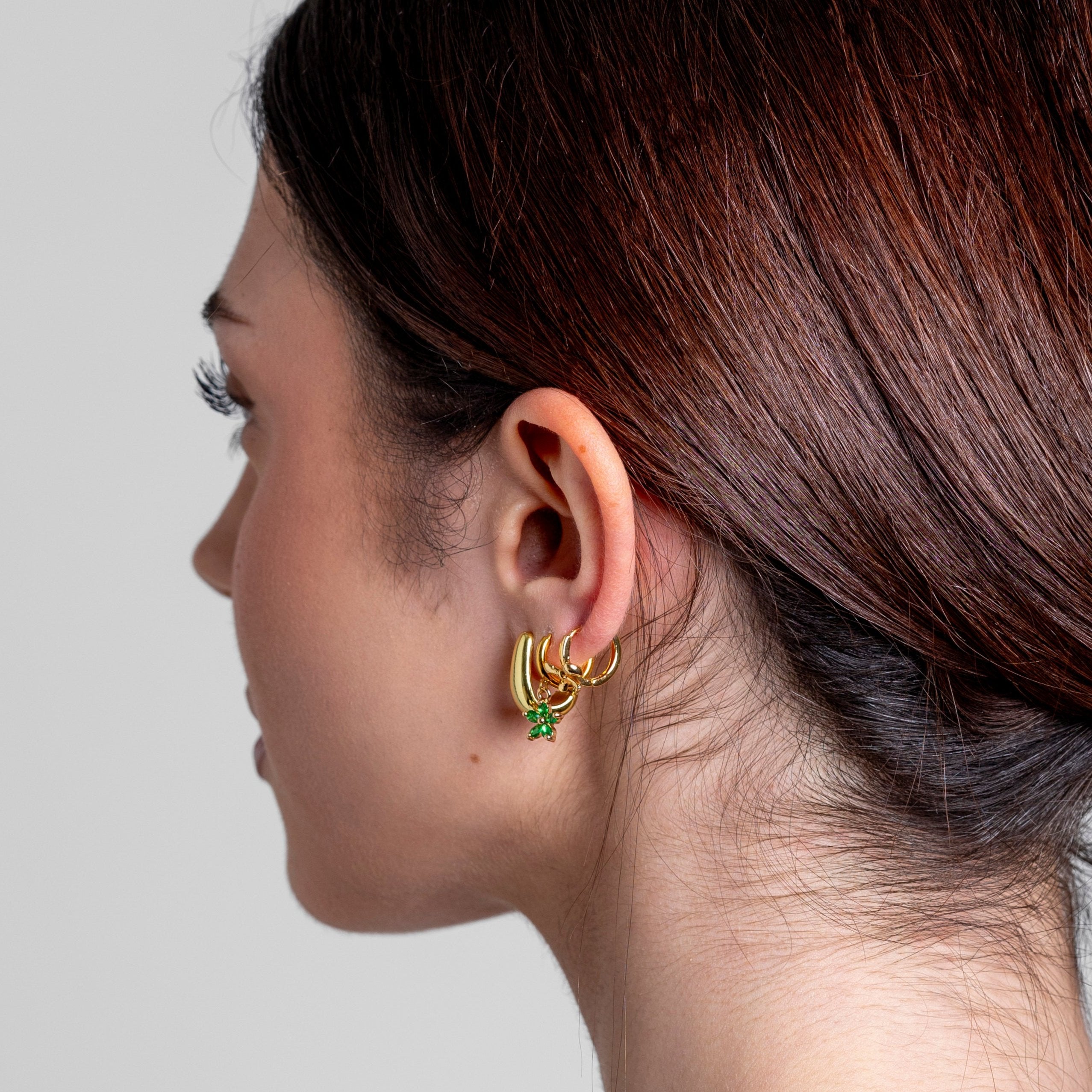 Bring a fresh pop of color to your ear game with the Emerald Bloom Huggies. Featuring green-studded flower charms, these huggies are the perfect blend of playful charm and effortless style. Designed to seamlessly pair with any look, they’ll have you feeling fresh, flirty, and ready for every season. A must-have for anyone who loves to bloom in style.